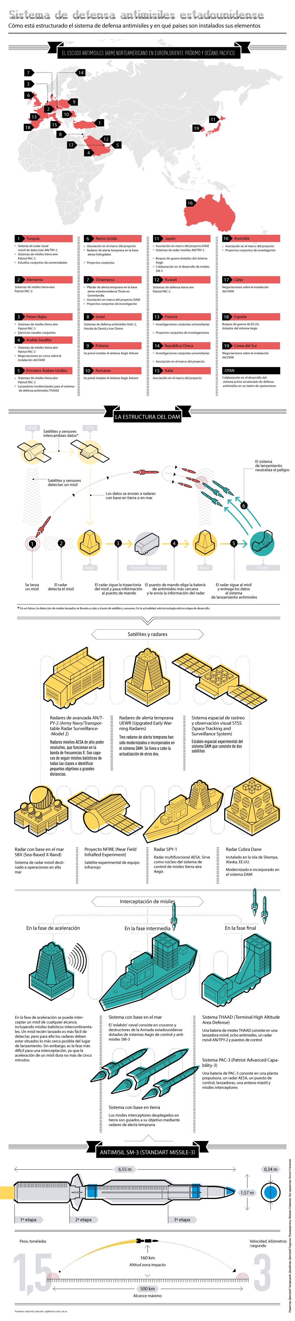 El Escudo Antimisiles de Washington es un sistema de defensa antimisiles diseñado para interceptar proyectiles enemigos antes de que alcancen su objetivo. La tecnología, que se desarrolla y utiliza en EE.UU., está diseñada para enfrentarse a misiles balísticos de todos los alcances: corto, medio, intermedio y largo. Dado que los misiles balísticos tienen distinto alcance, velocidad, tamaño y características de rendimiento, el sistema de defensa de misiles balísticos tiene una estructura de 'capas'. En la siguiente infografía se explica en detalle cómo funciona el sistema antimisiles estadounidense, cuyos distintos componentes están instalados en 19 países.