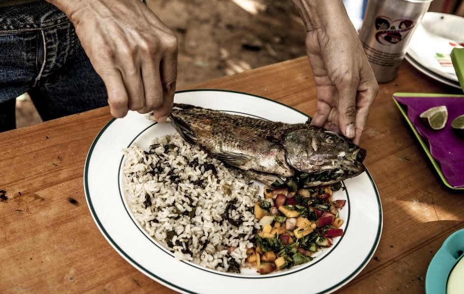 Detrás de una humareda donde se cocinan unos pescados, ella parece controlarlo todo: las brasas, los invitados, la siembra y a la cámara fotográfica.