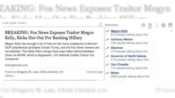 Ante todo en el tope de la selección surgió una historia completamente falsa de despido por la cadena Fox News de una de sus periodistas más prestigiosas y mejor pagadas, acusada de 'traidora'. "Urgente: Fox News tacha de traidora a Megyn Kelly y la echa por respaldar a Hillary [Clinton]", rezaba el anuncio. Pese a los múltiples clics, los lectores no tardaron en denunciar el anuncio, así como a la propia red tanto en sus muros como en Twitter.