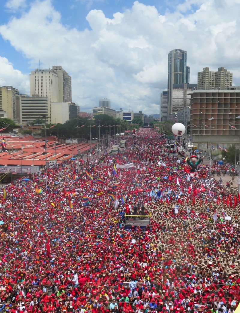 "Ellos en su este, en Miranda, y nosotros aquí, en nuestro centro, en la Caracas revolucionaria, con el pueblo", dijo el presidente Nicolás Maduro a una multitud vestida de rojo que colmó de punta a punta la Avenida Bolívar de la capital, la más ancha y amplia de la ciudad. La declaración no fue gratuita porque Caracas, estrictamente Caracas, fue ocupada únicamente por el chavismo.