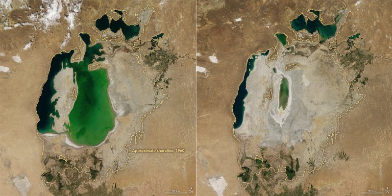 La NASA explica que si bien el riego hizo florecer el desierto, al mismo tiempo asoló el mar de Aral. A medida que el lago se secó, la pesca y las comunidades que dependían de ella se derrumbaron. El agua se hacía cada vez más salada y contaminada con fertilizantes y pesticidas, convirtiéndolo en un peligro para la salud pública, mientras se incrementaba la degradación del suelo.