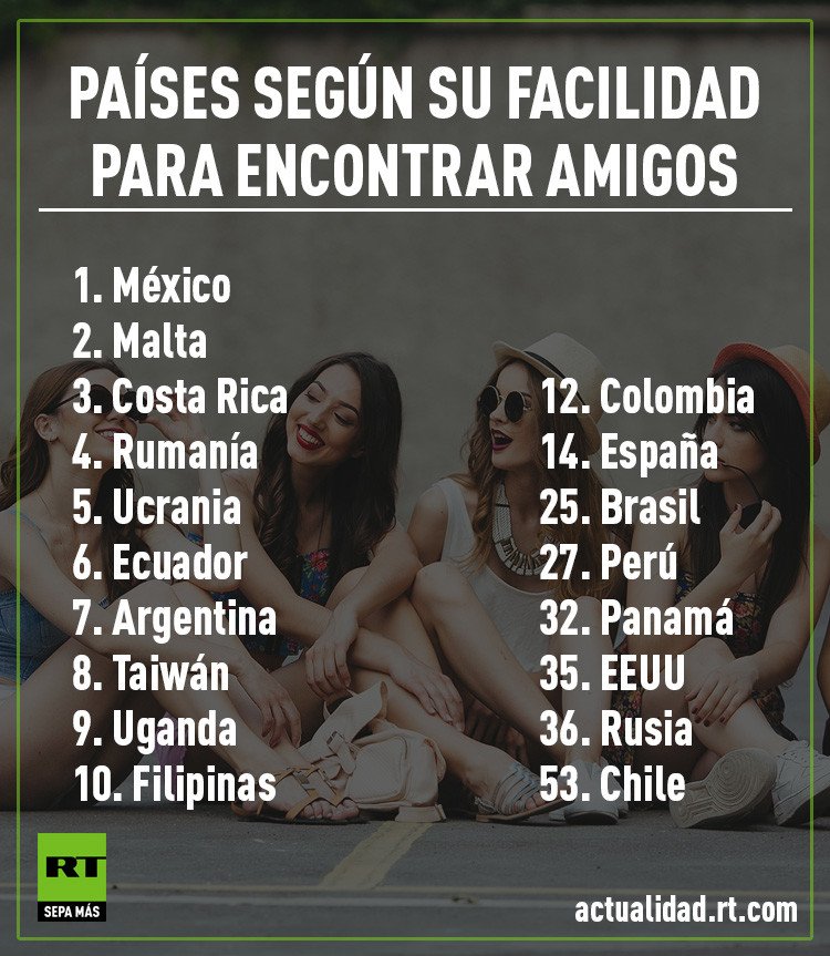 Entre otros aspectos, el informe priorizó los países según su facilidad para entablar relaciones de amistad y también según su grado de cordialidad. La lista cuenta con 10 países hispanohablantes (Argentina, Brasil, Chile, Colombia, Costa Rica, Ecuador, España, México, Panamá y Perú). Según el portal, México encabeza el 'ranking' de los países donde es más fácil encontrar amigos, mientras que Chile aparece al final del listado. Otro 'ranking' ubica a Costa Rica, México y Colombia entre los 5 países más amables para los expatriados.