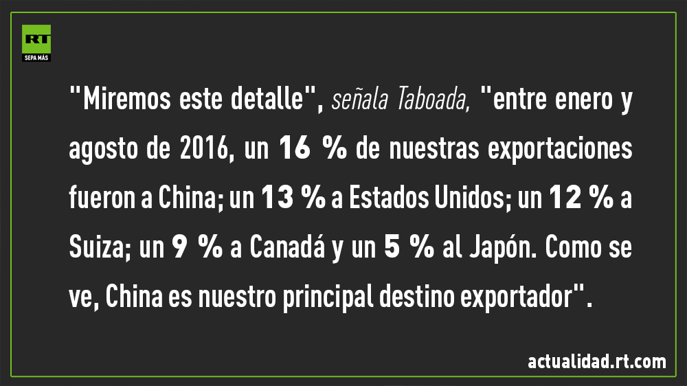 "Miremos este detalle", señala Taboada, "entre enero y agosto de 2016, un 16 % de nuestras exportaciones fueron a China; un 13 % a Estados Unidos; un 12 % a Suiza; un 9 % a Canadá y un 5 % al Japón. Como se ve, China es nuestro principal destino exportador".