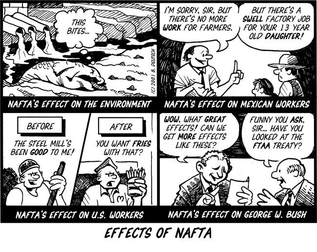 En 1994, uno de los hitos de esa política, fue el Tratado de Libre Comercio de América del Norte (TLC), firmado entre EE.UU., México y Canadá. Desde el principio, el "socio" más afectado fue el país azteca.