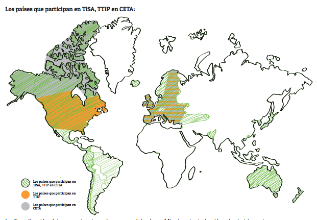 Este tratado afecta a 50 grandes economías, los 28 Estados miembros de la Unión Europea y otros 23 países que se han ido adhiriendo a las negociaciones durante los últimos cuatro años: Australia, Canadá, Chile, Colombia, Corea del Sur, Costa Rica, Estados Unidos, Hong Kong, Islandia, Israel, Japón, Liechtenstein, México, Mauricio, Nueva Zelanda, Noruega, Pakistán, Panamá, Paraguay, Perú, Suiza, Taiwán y Turquía.