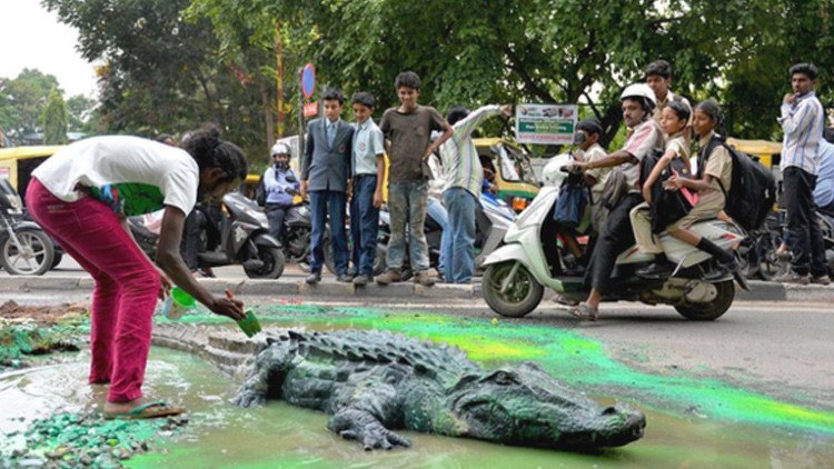 El año pasado en Bangalore, en el sur de la India, el artista Baadal Nanjundaswamy, frustrado por la falta de acción de las autoridades locales, esculpió un cocodrilo de tamaño natural en un bache de una carretera.