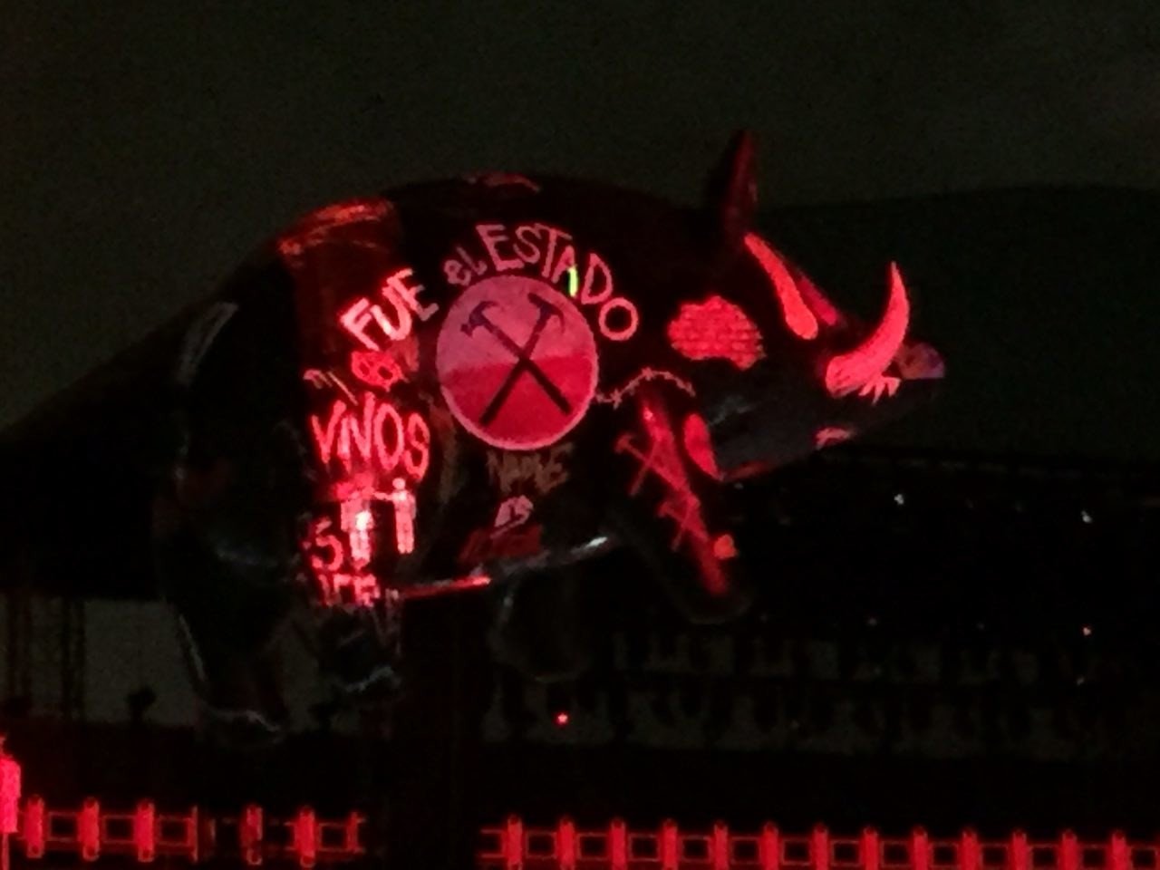 Minutos antes, mientras Waters tocaba la canción 'Pigs', voló encima de los espectadores un gran cerdo aerostático negro cuando el escenario se transformó a la manera de la portada del disco 'Animals', inspirado en la novela 'Rebelión en la granja' del escritor británico George Orwell.