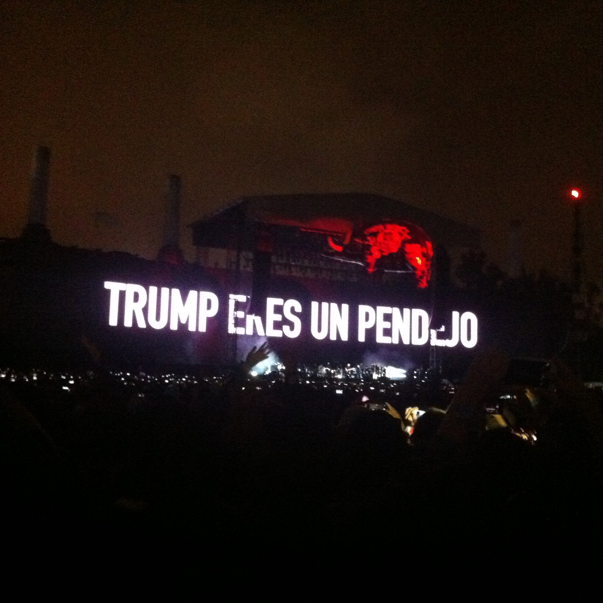 Al tocar la canción 'Pigs', y mientras el cerdo aerostático flotaba encima de los asistentes, la pantalla del gran escenario mostró caricaturas, algunas sexuales, del candidato republicano a la presidencia de los Estados Unidos, Donald Trump. En un momento, apareció un mensaje en castellano: "Trump, eres un pendejo".