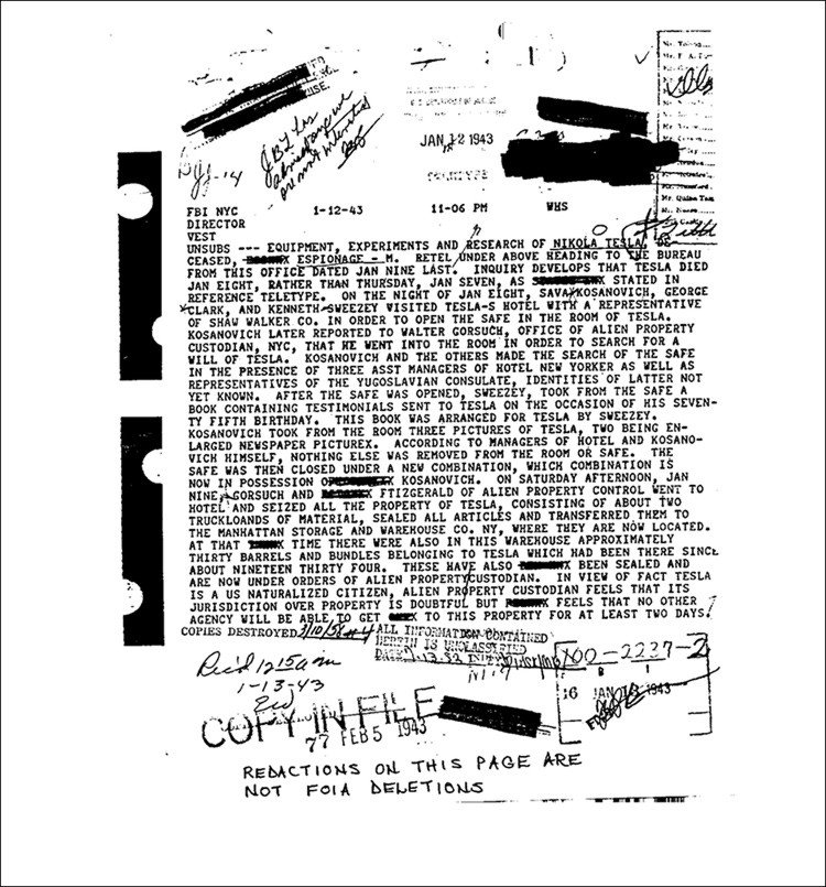 Entre los documentos dados a conocer figura una epístola dirigida a John Edgar Hoover, el primer director del FBI, que destaca un artículo sobre la invención del 'rayo de la muerte' de Tesla y sugiere que podría ser de "vital importancia" para el Departamento de Defensa estadounidense, así como para las "naciones ahora controladas por dictadores dementes".
