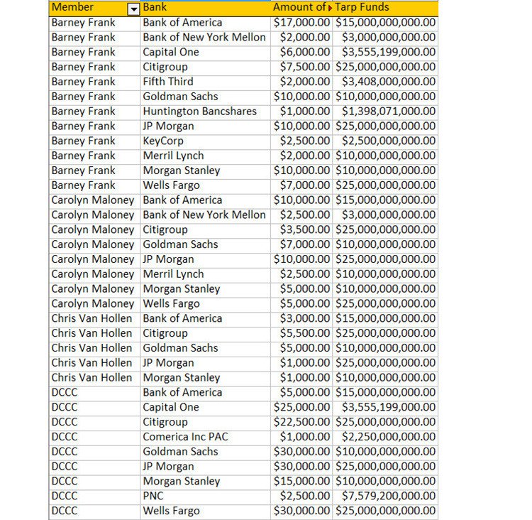 Esos documentos, incluidos en una carpeta denominada 'Pagar por jugar', incluyen información sobre los principales donantes del Partido Demócrata y su relación con las ayudas que entrega el Programa para Aliviar los Activos Problemáticos (Tarp, por sus siglas en inglés), una iniciativa oficial de Estados Unidos para comprar acciones de instituciones financieras con vistas a fortalecer ese sector.
