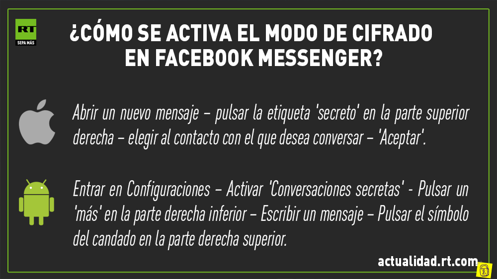 Los usuarios de Facebook Messenger en móviles ya pueden usar un modo secreto que encripta los mensajes en sus dispositivos. Esta función permite que los mensajes puedan ser leídos solamente por las partes que mantienen la conversación. Nadie más, ni siquiera los administradores de Facebook, pueden leer los mensajes cifrados.