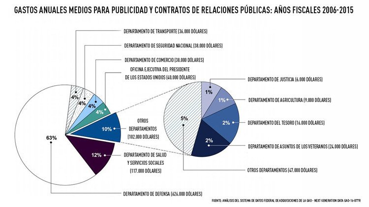 Según las cifras reveladas, el Pentágono emplea al 40% del personal del Gobierno estadounidense encargado de las relaciones públicas y en total fue responsable de casi el 63% de gastos en esta área entre 2006 y 2015.