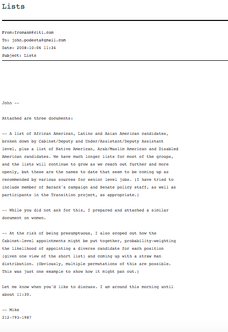 El correo electrónico está escrito por Michael Froman, actual representante de Comercio de Estados Unidos quien en aquella fecha trabajaba como ejecutivo para Citibank. Con el asunto "listas", se dirige a Podesta para comunicarle que le adjunta tres documentos.