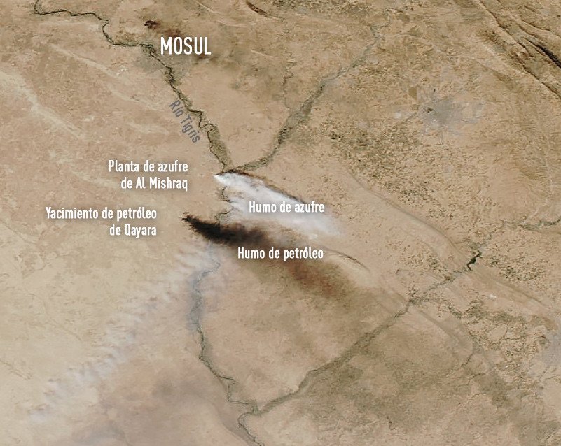 La primera imagen, tomada el pasado 22 de octubre, muestra dos columnas de humo correspondientes a las emanadas por el incendio en la planta de azufre de Al-Mishraq, situada a unos 38 kilómetros al sur de Mosul, y de los campos petroleros de Qayara, que también fueron incendiados por los terroristas.