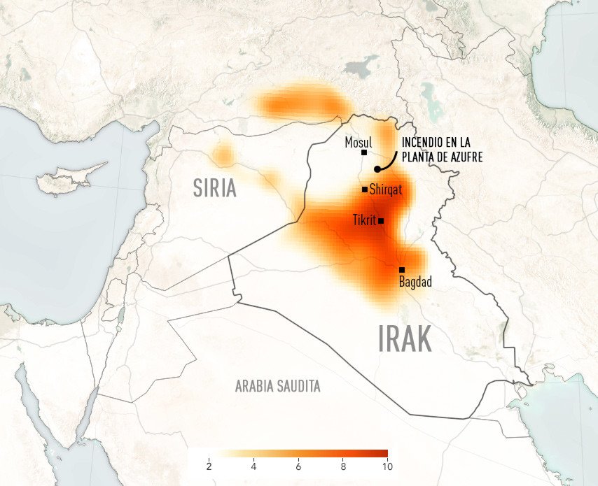 Mientras que la segunda imagen satelital, tomada el 24 de octubre, revela que la nube invisible de dióxido de azufre se ha diseminado más allá de Irak, llegando a países como Siria y Turquía. En altas concentraciones, este gas puede provocar problemas respiratorios e incluso amenazar la vida. En efecto, la agencia espacial estadounidense señala que dos personas han muerto después de haber estado expuestas a altas concentraciones de dióxido de azufre, mientras que otras 1.000 han sido tratadas por problemas respiratorios.