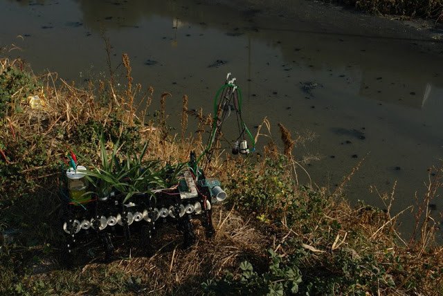Después de los parásitos urbanos, Esparza creó otro ser, simbionte entre plantas, bacterias y una máquina, que camina solitario y lento al lado de ríos contaminados para alimentarse de ellos y limpiar el agua.