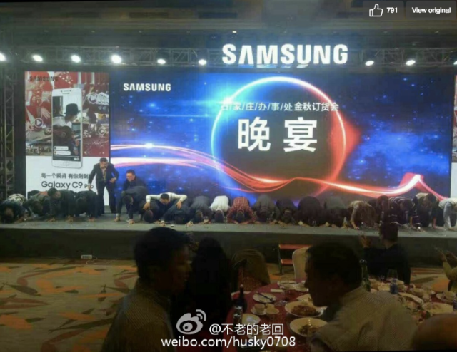 En un intento de ganarse de nuevo la confianza de los consumidores chinos tras retirada masiva en el país de los 'explosivos' Galaxy Note 7, una veintena de ejecutivos surcoreanos y chinos de Samsung se arrodillaron en una reunión con los distribuidores locales en Shijiazhuang, China, el pasado 29 de octubre.