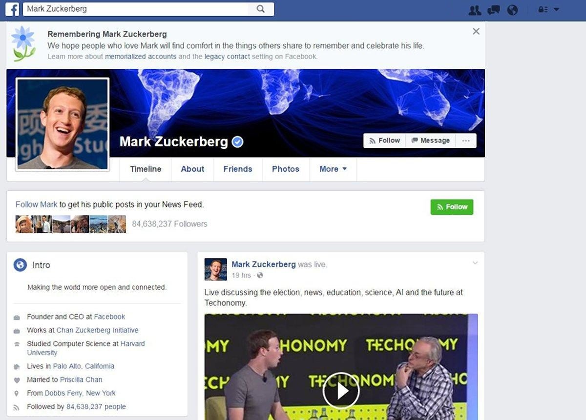 Este error ha afectado incluso al perfil del fundador de la red social, Mark Zuckerberg, cuya página privada también se ha convertido en un memorial. "Esperamos que las personas que quieren a Mark encontrarán consuelo en las cosas que otros comparten para recordar y celebrar su vida", decía el mensaje que apareció en la cuenta del creador de Facebook antes de ser corregida.