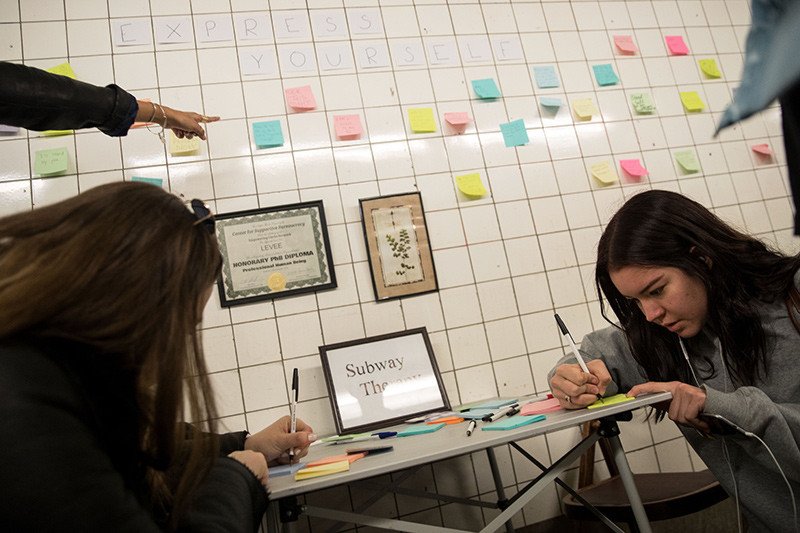 En el túnel de la estación Union Square, el artista Matthew Chavez ha instalado su 'clínica' denominada 'Subway Therapy' (Terapia de metro), donde reparte a los viajeros de forma gratuita notas adhesivas para que dejen sus opiniones. El lugar se ha convertido en uno de los foros públicos más significativos de la ciudad, donde las personas dejan mensajes de amor y apoyo, de miedo, ira y esperanza.