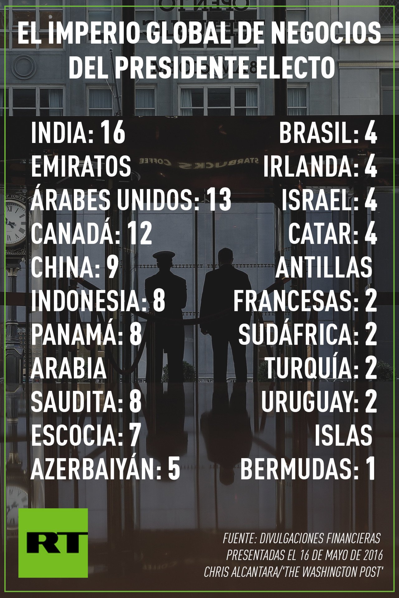 Asimismo, el periódico publicó una infografía que muestra 18 países del "imperio global de negocios del presidente electo", y observa que Trump tiene un gran número de propiedades fuera de EE.UU.: