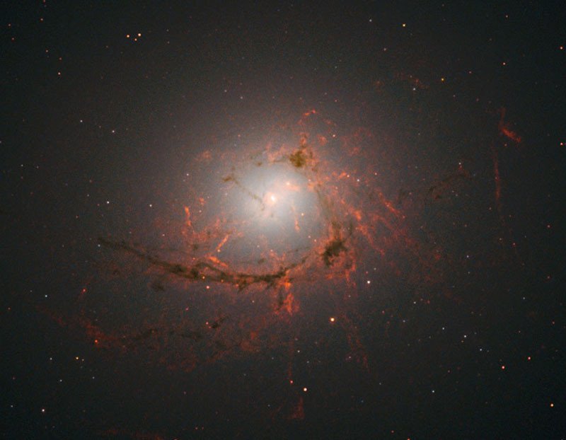 Una imagen del telescopio espacial Hubble de la NASA captó el momento en que una galaxia es estrangulada por 'hilos' de polvo, mientras desde su interior la 'devora' un agujero negro supermasivo.