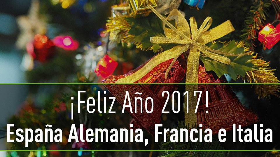23.00 GMT. ¡Deseamos un feliz 2017 a España, Francia, Alemania e Italia! Los españoles tienen la pintoresca tradición de celebrar la Nochevieja comiendo las doce uvas de la suerte, una por cada campanada que marca el final del último día del año, una tradición también arraigada en otros países hispanohablantes.