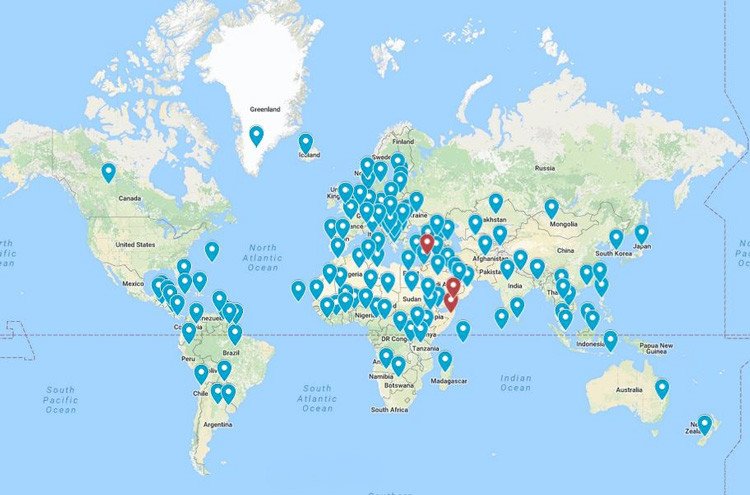 El mapa muestra 132 de los países en los que se encuentran desplegadas fuerzas especiales estadounidenses; 129 emplazamientos (azules) fueron suministrados por el Comando de Operaciones Especiales de EE.UU.; 3 emplazamientos (rojos) - Siria, Yemen y Somalia - se obtuvieron de información de código abierto.