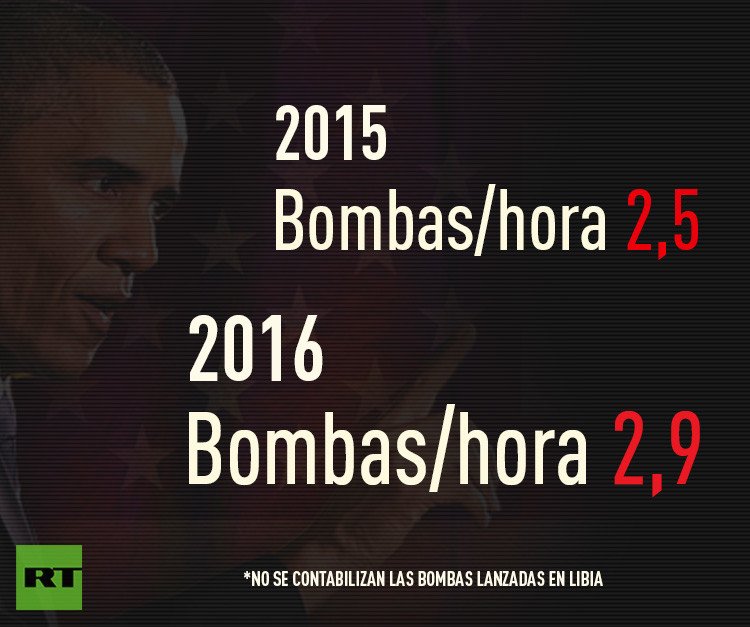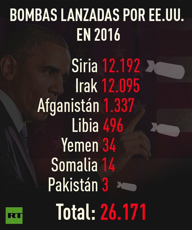 Para analizar el legado del presidente Obama, el Consejo de Relaciones Exteriores de EE.UU. (CFR, por sus siglas en inglés), que se especializa en política exterior y asuntos internacionales del país, presentó datos sobre los ataques aéreos lanzados sobre países extranjeros. Solo en 2016, el Gobierno de Obama arrojó al menos 26.171 bombas.