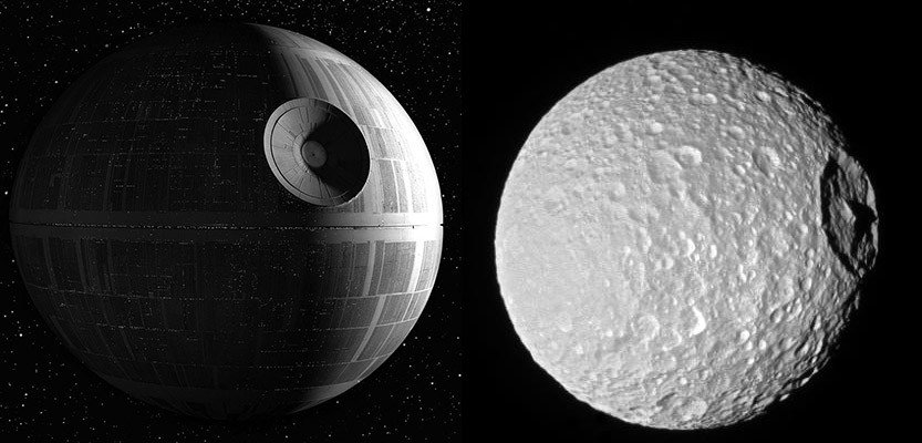 En su vuelo más cercano sobre Mimas, la luna de Saturno, la nave espacial Cassini ha tomado la quizá más detallada imagen hasta la fecha de este satélite del planeta. En la foto publicada en el sitio web de la NASA se aprecia el aspecto redondeado del enorme cráter de la luna y el gran pico existente en su centro. Su aspecto es muy similar a la Estrella de la Muerte de la saga de 'Star Wars'.