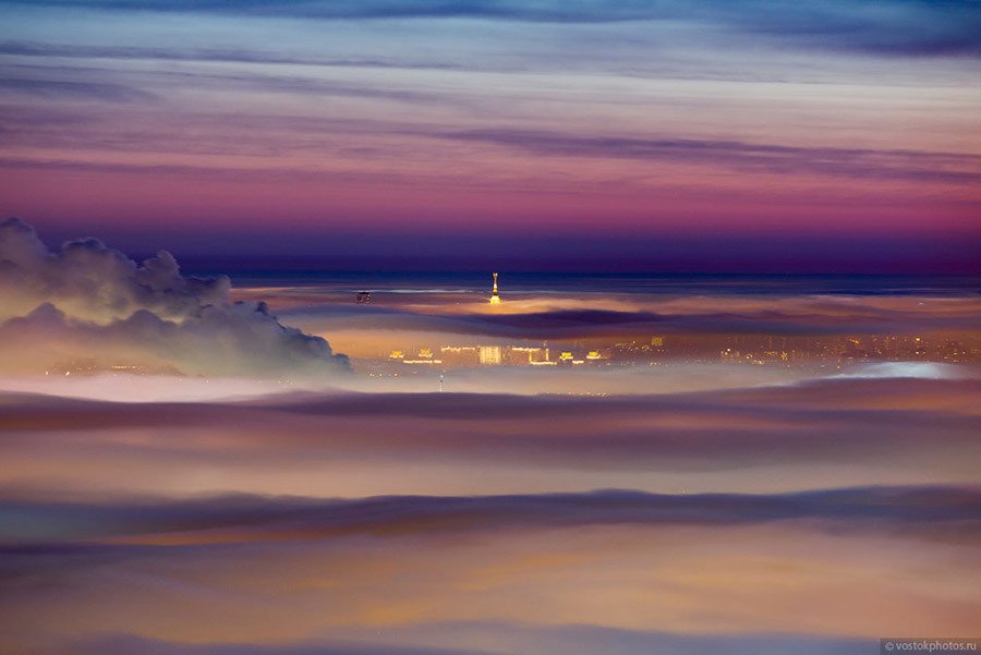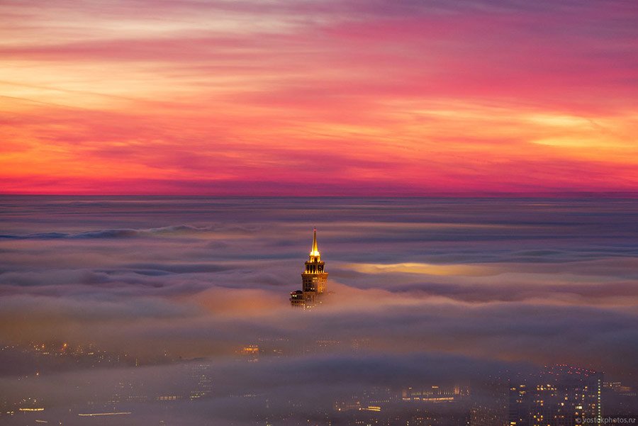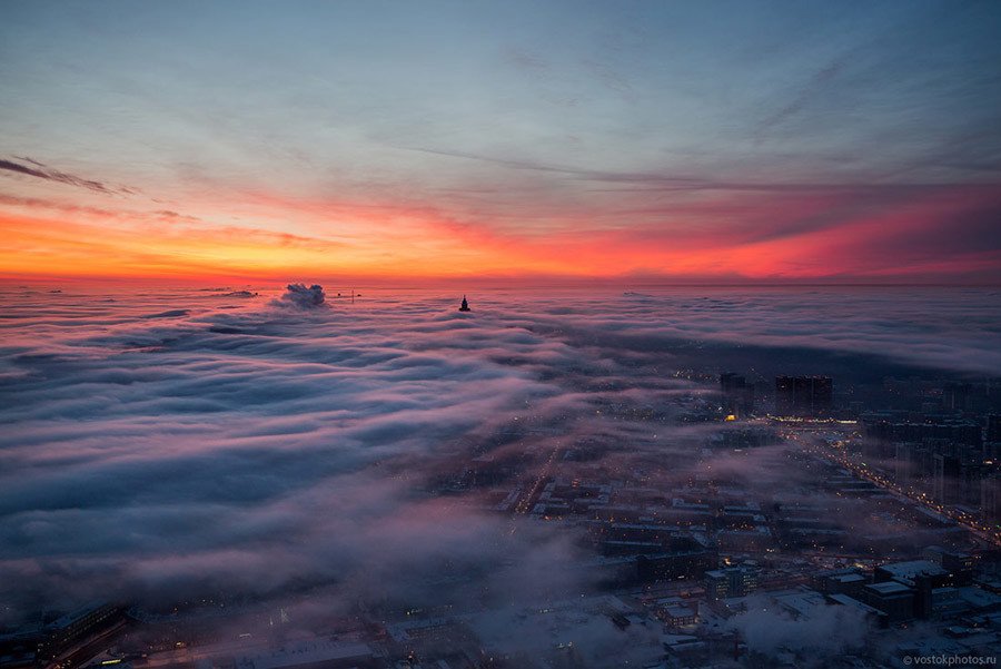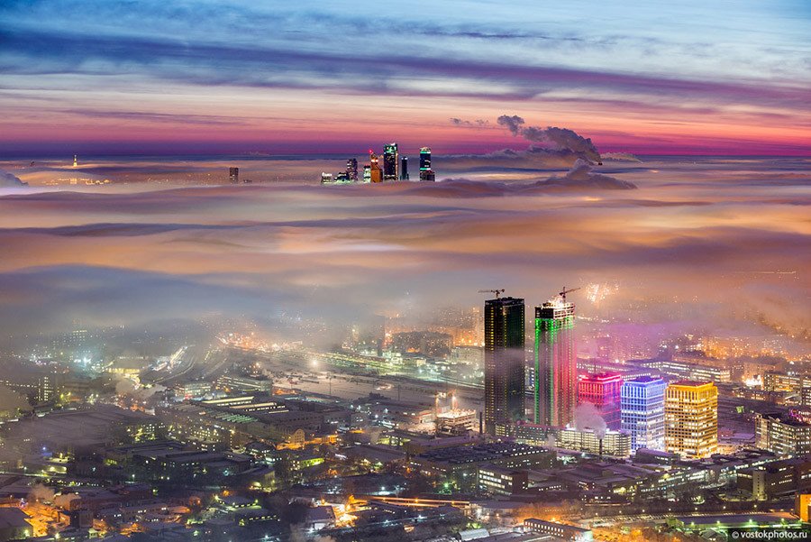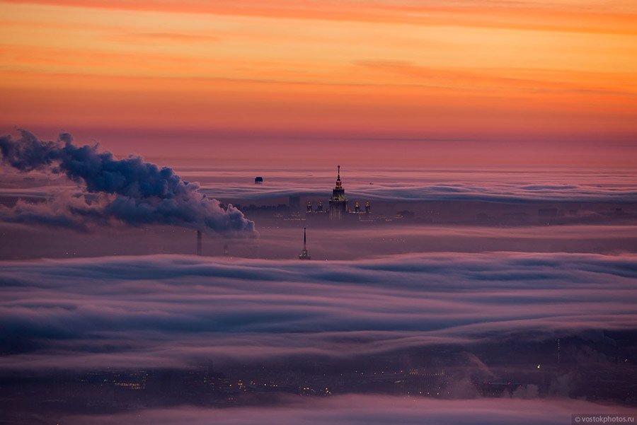Gracias a un especial fenómeno natural que se vive pocas veces en el año, el conocido fotógrafo moscovita Dmitri Chistoprudov logró capturar sobrecogedoras imágenes de la capital rusa a una altura de 340 metros.