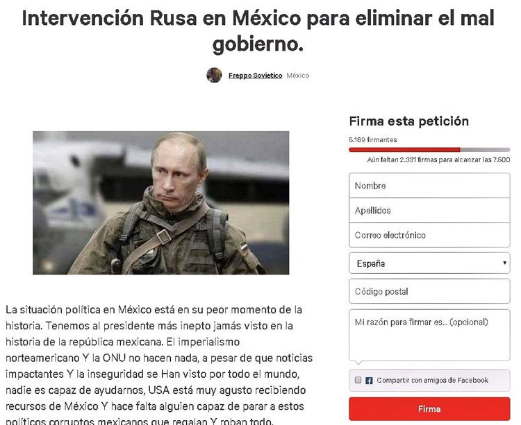 Más de 8.000 personas han firmado ya la petición creada esta semana en el portal Change.org en la que se pide que Rusia intervenga en México para acabar con el "mal gobierno" pues -argumentan- hay que "parar a estos políticos corruptos mexicanos que regalan y roban todo".