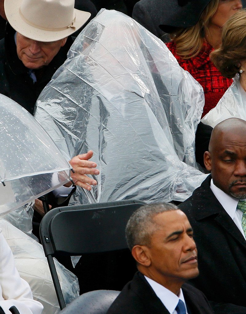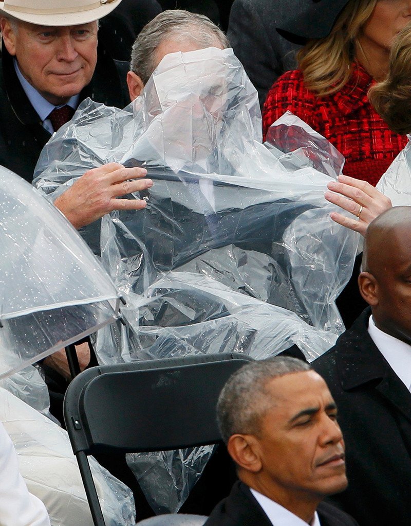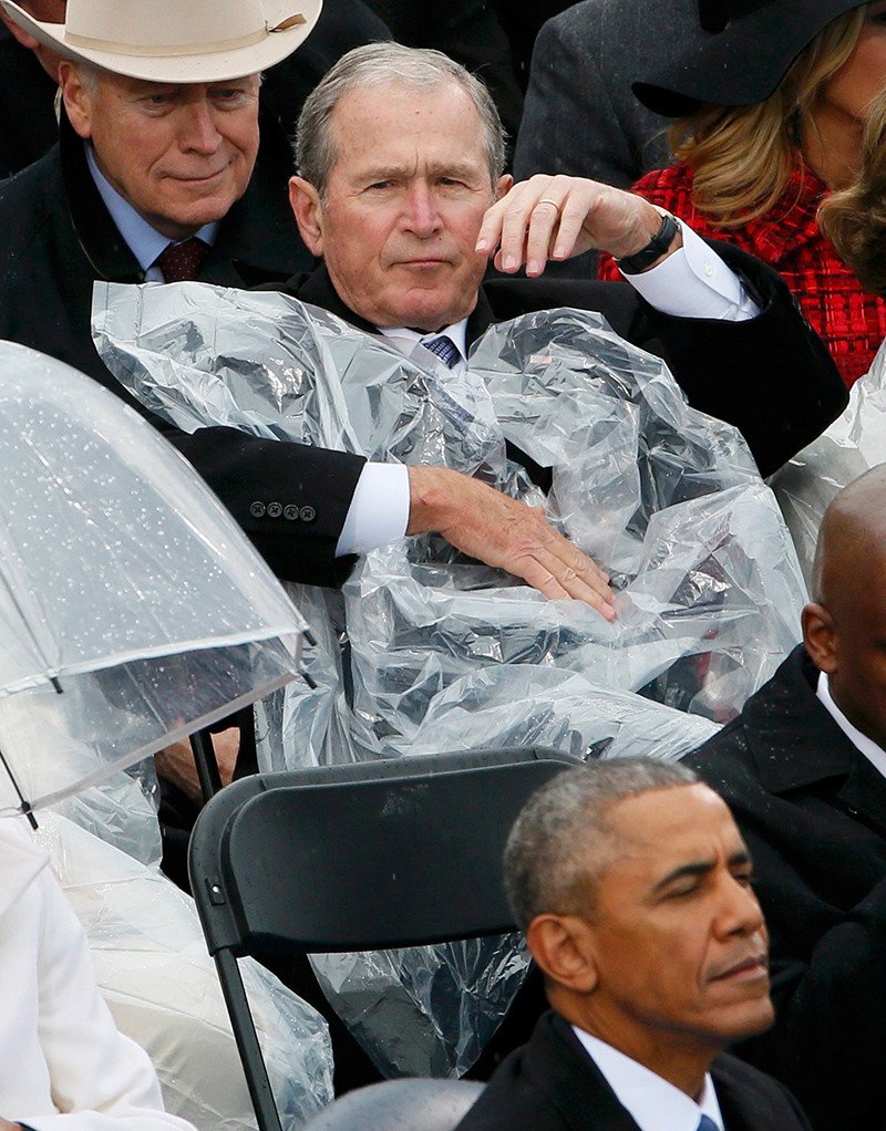 La precipitación sorprendió a los invitados que se encontraban en el escenario principal y muchos de ellos, incluido Bush, recorrieron a los ponchos plásticos para cubrirse del aguacero. Sin embargo, el viento y el poco espacio jugaron una mala pasada al expresidente, quien tuvo que luchar con la prenda para quitársela de encima. Cuando finalmente logró librarse del poncho, Bush mostró una sonrisa cómplice.