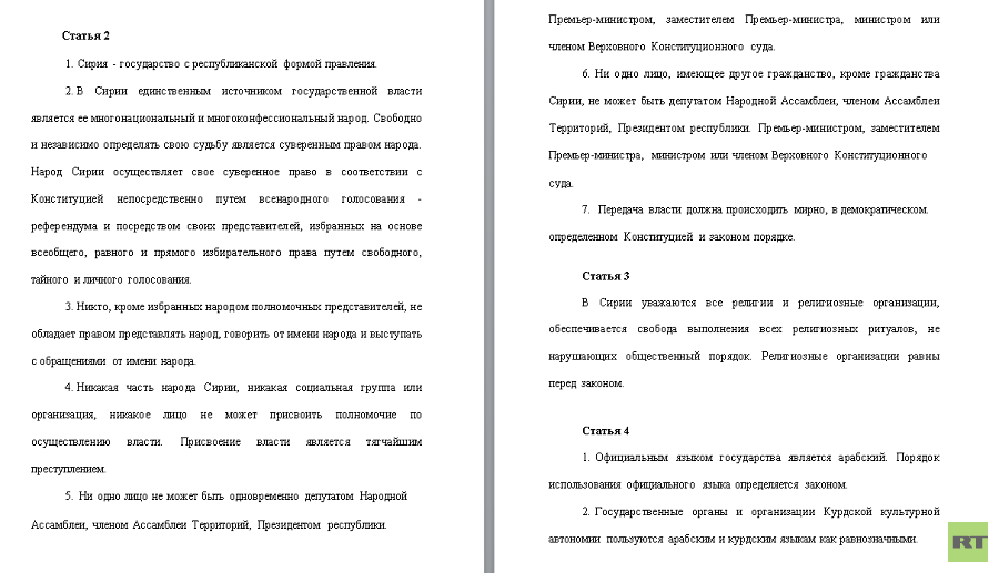 En el marco de las negociaciones, esta semana se han presentado diferentes ideas y proyectos para poner fin a la guerra civil, entre ellos una serie de propuestas para dotar a Siria de una nueva Constitución, entre ellas el borrador planteado por Rusia al que ha tenido acceso en exclusiva RT.