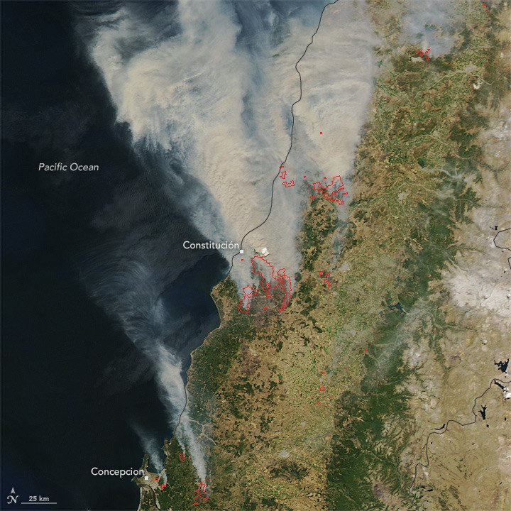 El primer documento gráfico, que data del 20 de enero, muestra humo fruto de varios incendios "cerca de la ciudad costera de Pichilemu", según explica la agencia aeroespacial estadounidense, que detalla que los contornos rojos "indican áreas de calor" con "fuego activo".