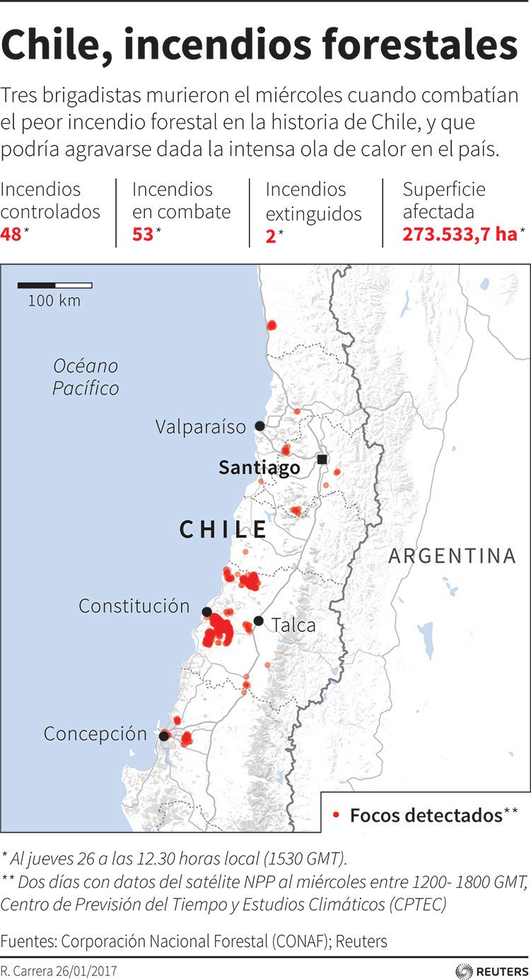 Las autoridades de Chile aseguran que, al menos, 94 incendios siguen activos en siete regiones en la zona centro y sur de su territorio. Esta crisis ha cobrado tal magnitud que países como Rusia, Argentina, México, Perú, Colombia, España, Brasil, EE.UU. y Francia han anunciado que enviarán ayuda.