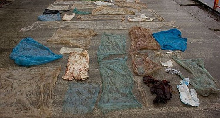 Una ballena de dos toneladas quedó varada en la costa suroeste de Noruega, al parecer gravemente enferma y moribunda. Los especialistas que acudieron en su ayuda no pudieron hacer otra cosa que sacrificarla, pues se hallaba en estado terminal. Los zoólogos que se hicieron cargo de los restos hallaron en el aparato digestivo del cetáceo unas 30 bolsas y otros desperdicios de plástico.