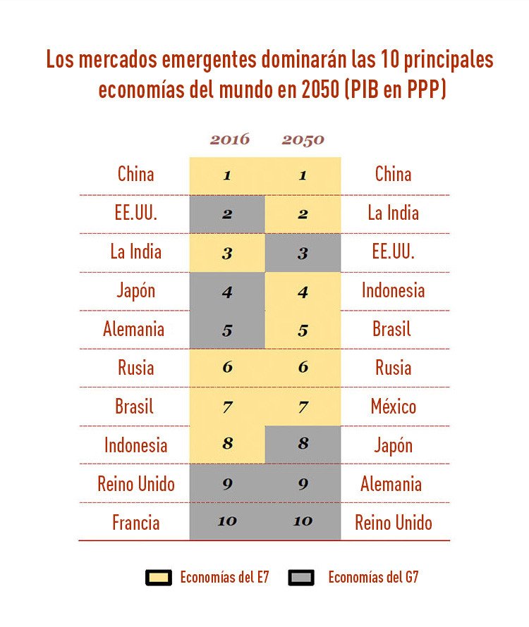 - En consecuencia, se espera que en 2050 seis de las siete economías más grandes del mundo serán países emergentes, liderados por China (1.ª), la India (2.ª) e Indonesia (4.ª).