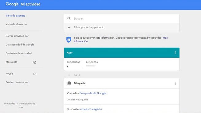 -Paso dos: Encontrará una pestaña que dice 'Mi actividad', allí verá de forma detallada todo lo Google sabe de usted. Si lo desea, puede filtrar su búsqueda con diferentes características.