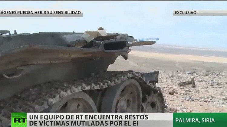 Las cámaras de RT han sido testigo del horror causado del Estado Islámico en una serie de imágenes registradas en el desierto cerca de la antigua ciudad siria de Palmira. En las espeluznantes secuencias grabadas por un equipo del canal pueden apreciarse cadáveres quemados y mutilados que yacen no muy lejos de la recién liberada ciudad siria.