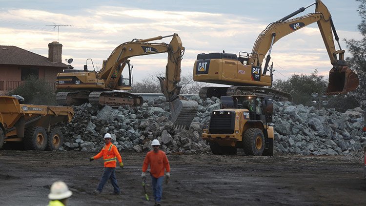 Los operarios trabajan 24 horas al día en las inmediaciones del lago de Oroville. Rompen grandes cantidades de roca y meten los escombros en sacos, que trasladan a las zonas de la presa que necesitan apuntalamiento. En especial, refuerzan el desagüe, incluso hemos visto como los helicópteros recogen esas bolsas y las depositan directamente en su cráter, para tapar el agujero y, por lo menos, ganar un poco de tiempo.