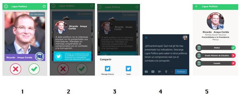 "Entonces aparece una ventana con un mensaje que dice algo así: 'Felicidades, este candidato sí te corresponde, porque sí presento su 3 de 3 (declaraciones patrimoniales), entonces mándale un tuit para felicitarlo'. Pero si no lo había presentado, el mensaje es como '¡Uy!, ¿qué crees?, este candidato no te corresponde porque no ha presentado su 3 de 3; mándale un tuit pidiéndole que así lo haga'", explicó el promotor del 'Tinder de los políticos'.