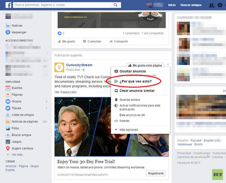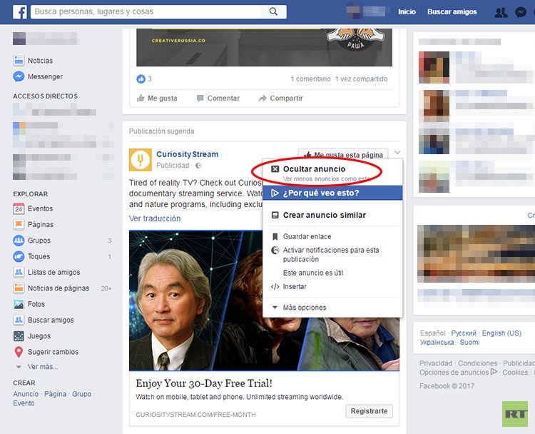 Para empezar, en la sección de cada anuncio que vemos en las noticias en Facebook existe un menú que se puede abrir mediante una flecha pequeña que se encuentra cerca de la esquina superior derecha del anuncio. Si hace clic en la flecha, podrá elegir la opción "Ocultar anuncio (Ver menos anuncios como este)".