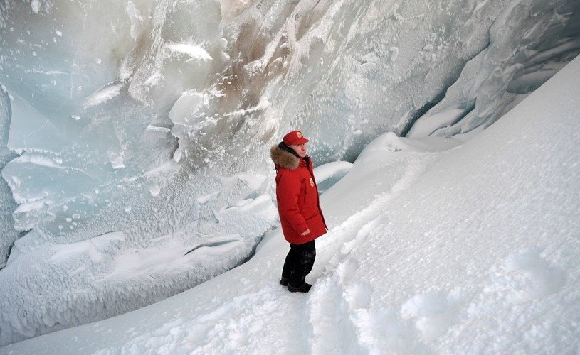 En la entrada a una cueva formada en un glaciar que se está derritiendo paulatinamente, el presidente Putin utilizó un piolet para desprender unos fragmentos de hielo, que serán sometidos a un análisis bioquímico. Los científicos explicaron que la cueva les sirve para investigar desde su interior los estratos inferiores del permafrost, la capa de suelo permanentemente congelada sobre la que se asientan regiones enteras del norte de Rusia.