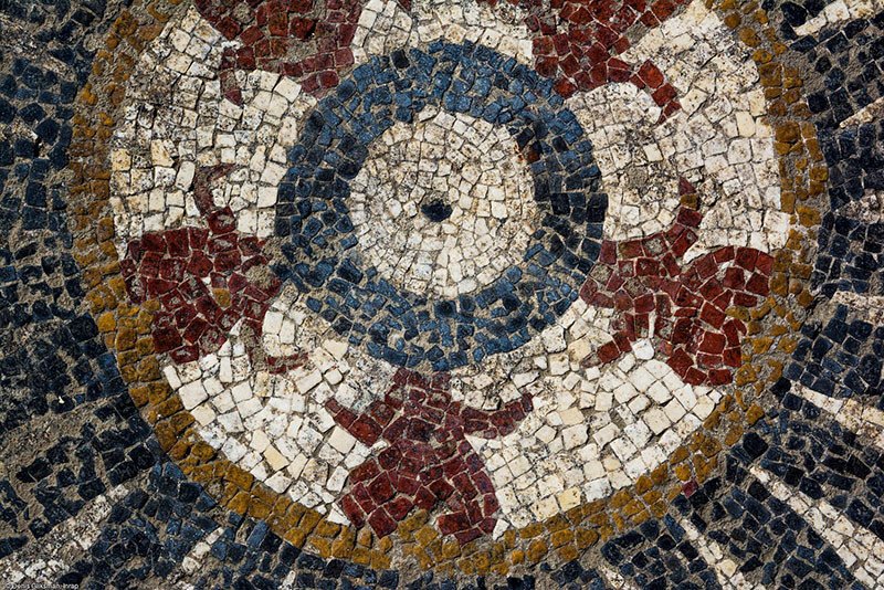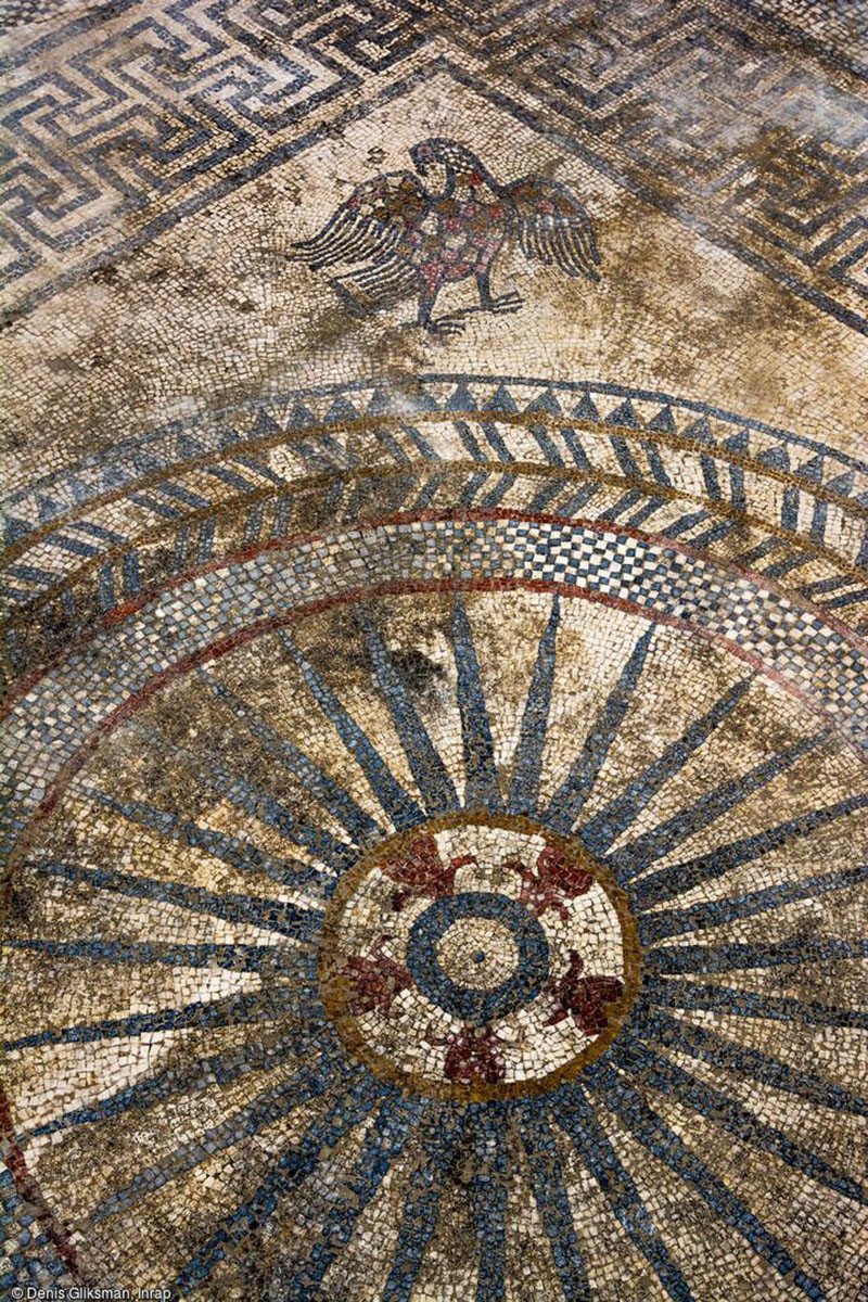 Lo más valioso del hallazgo es un complejo pavimento mosaico, que se sitúa en el suelo de una sala dentro de un edificio de 250 metros cuadrados con una columnata. Dos grandes mosaicos son adornados con motivos geométricos que marcan dos medallones centrales compuestos por coronas, rayos y cheurones. Se observan claramente un búho, un pato, un águila y un cervato.