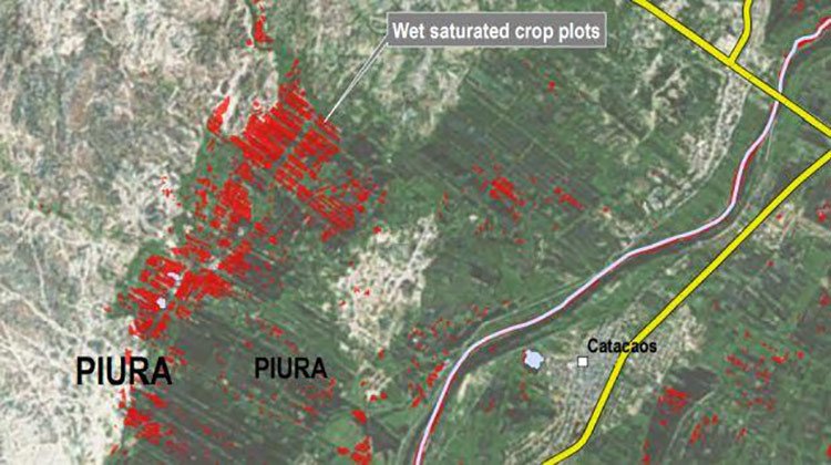 El análisis de UNITAR, basado en las imágenes satelitales del Gobierno canadiense, indica que la región está llena de pozos de agua, y la situación se agrava en las parcelas de cultivos al oeste de Catacaos y al este de los centros poblados de Chatito y Sinchao.