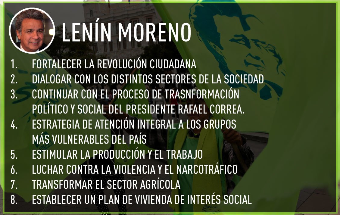 Por otro lado, el oficialista había considerado que su actual oponente, el banquero Guillermo Lasso del movimiento CREO, sería el pretendiente más fácil de derrotar en la segunda vuelta, igual que sucedió cuando Correa venció en 2006 al "hombre más rico del Ecuador", Álvaro Noboa.