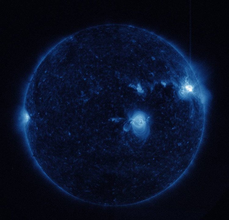El pasado fin de semana, el telescopio espacial Solar Dynamics Observatory de la NASA, que observa constantemente el comportamiento del Sol, capturó imágenes de tres erupciones solares de nivel medio en la parte superior derecha de ese astro: dos alcanzaron su punto máximo a las 8:02 GMT y a las 20:33 GMT del 2 de abril, mientras que el tercero tuvo su auge a las 14:29 GMT del día 3.