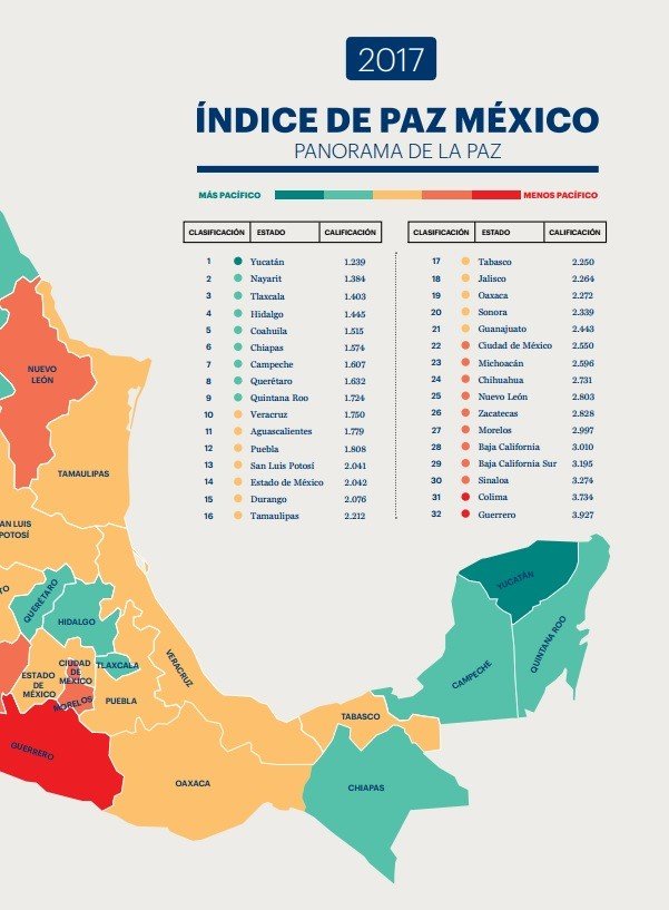 En 2016 el Índice de Paz México que elabora la organización retrocedió un 4,3% con respecto a 2015. El Instituto para la Economía y la Plaz considera en el informe que este ratio disminuye a mayor número de homicidios, delitos con violencia o con armas de fuego, crímenes de la delincuencia organizada y presos sin condena.