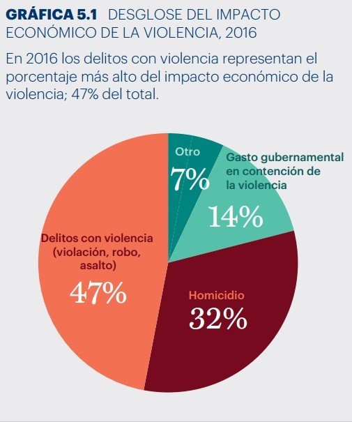"El impacto económico de la violencia fue de 3,07 billones de pesos en 2016 (180.000 millones de dólares), lo que representa un aumento de 79.000 millones de pesos en el último año. Esto equivale a cerca del 18% del PIB de México o 25.130 pesos por persona", recoge el documento.