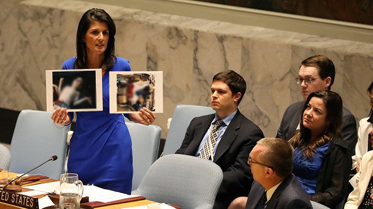 Durante la reunión del Consejo de Seguridad de la ONU convocada este miércoles Haley presentó fotos de supuestas víctimas del ataque.